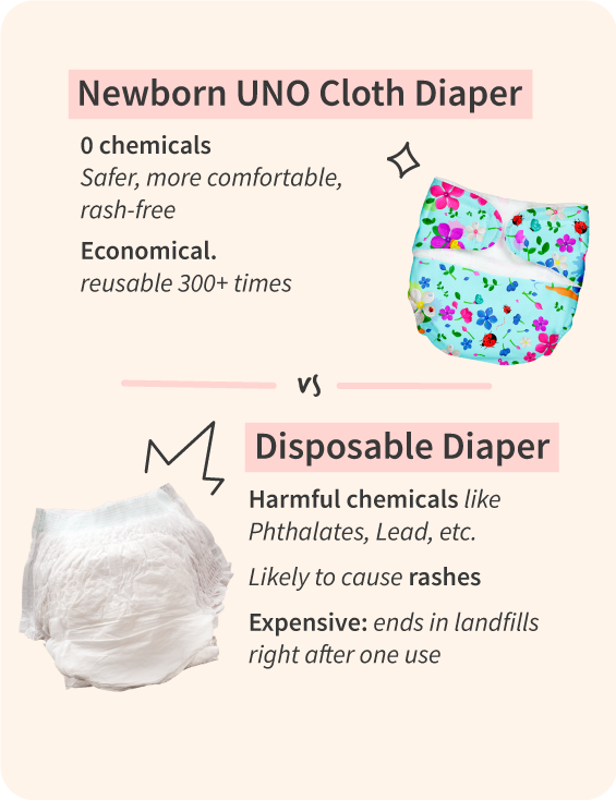 - UNO is adjustable, washable and reusable upto 300+ times whereas disposable diapers go in the landfills right after one use