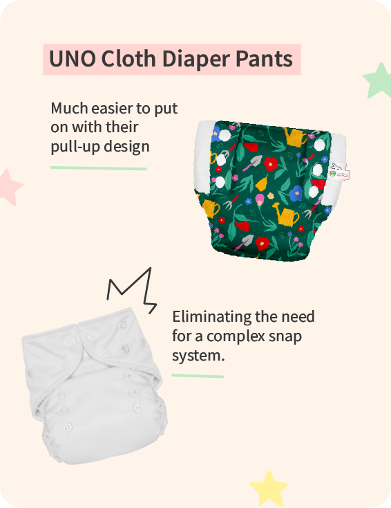 Traditional cloth diapers can be frustrating with their complex flaps and snap systems. Our new pull-up style UNO Cloth Diaper Pants for baby eliminate this hassle.