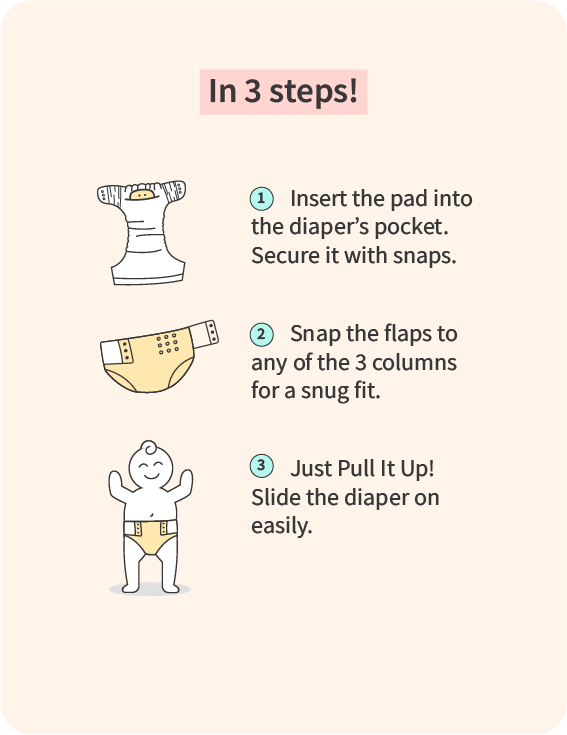 Simply insert the pad into the pocket opening of the diaper shell, secure it with the snap, close the elasticated side snaps to form the pant shape, and pull it up like underwear. To take it off, just unbutton the flaps and cleanly remove a soiled diaper without running it down your baby’s legs.