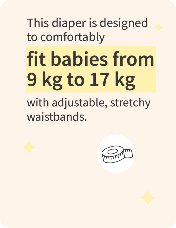 It comes in a single size. This diaper is designed to fit babies from 9 kg to 17 kg with adjustable, stretchy waistbands and leg openings.