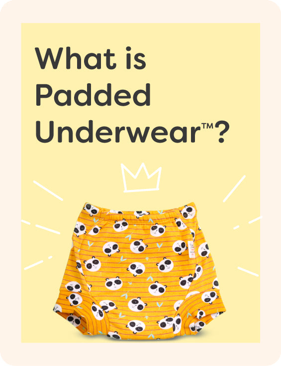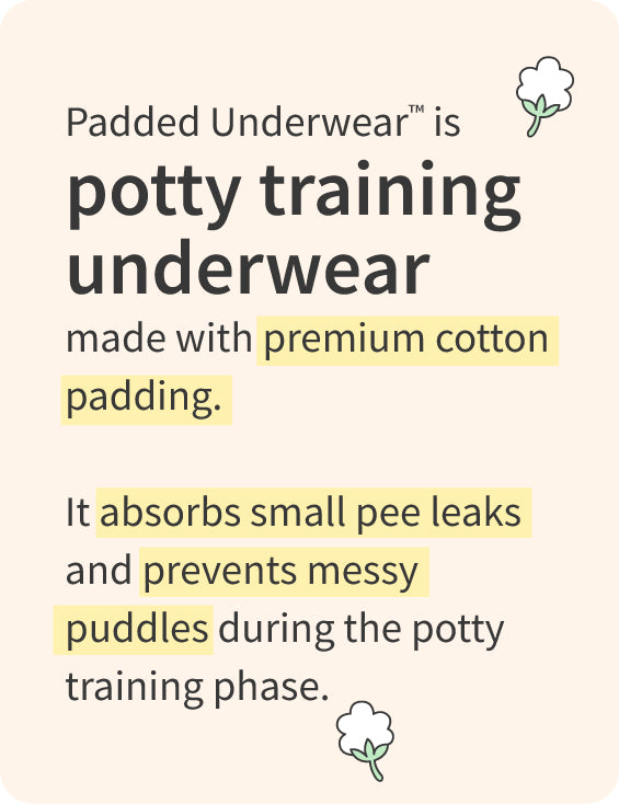 Padded underwear is soft underwear with an extra layer of padding designed to absorb small leaks during potty training. It helps babies and toddlers feel when they need to use the toilet and learn to recognise wetness.