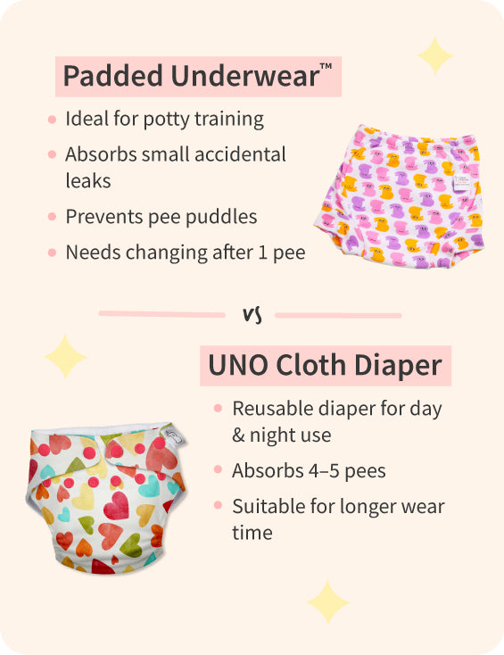 Padded underwear is ideal for day-time potty training, but not meant for heavy wetting or overnight use like regular diapers.