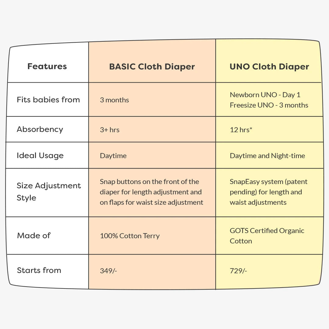 - UNO fits babies from Day 1, whereas BASIC Cloth Diaper fits babies from 3 months onwards.
