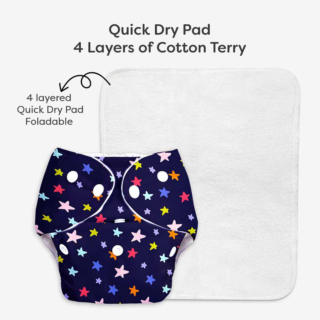 BASIC Cloth Diaper is now trimmer with a reduced number of snap buttons. Fits better, feels more comfortable. The Quick Dry UltraThin Pads are foldable style, 4 layered pads which can be attached to the cloth diaper. Its UltraThin Design is light for the baby, fits better and trimmer. It dries 2 times faster than other pads.