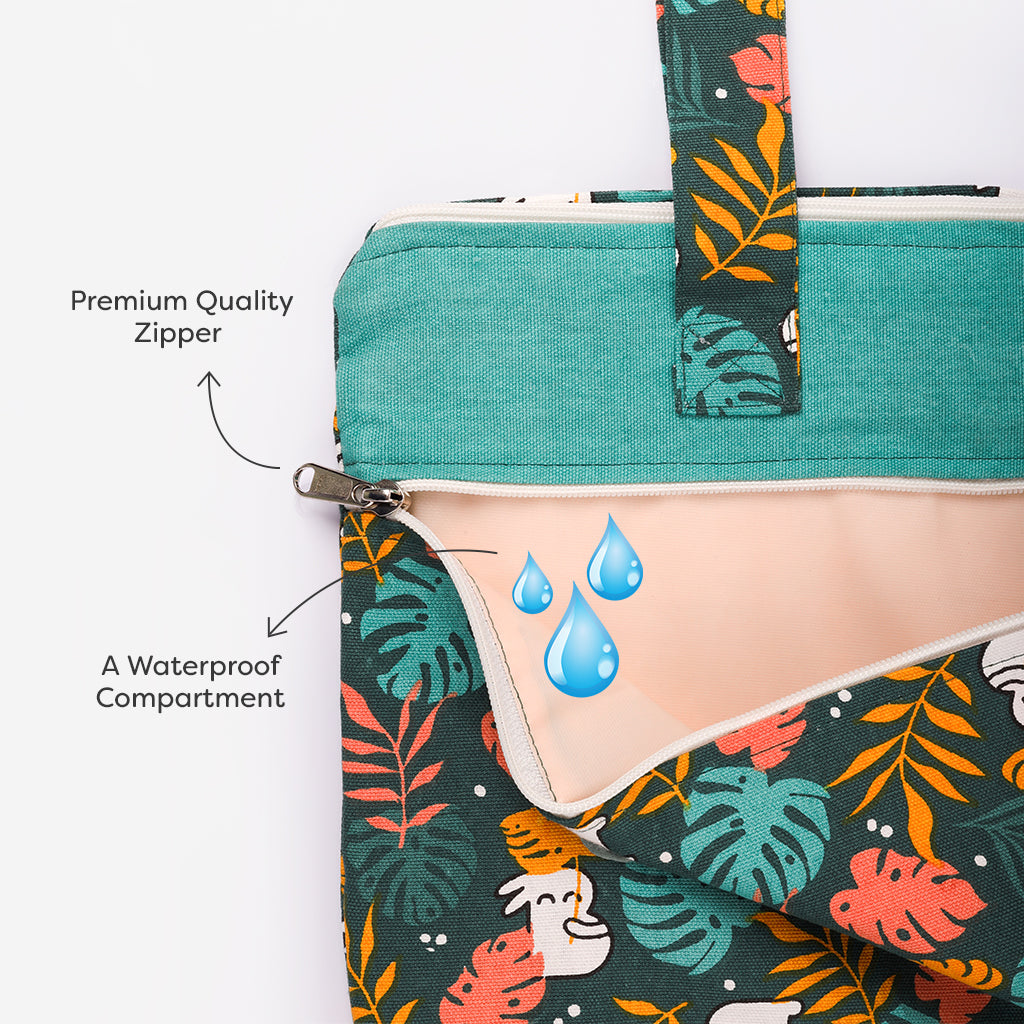 The Multipurpose Tote features a spacious main compartment crafted from 100% cotton canvas, and an extra compartment with waterproof lining in front. The waterproof section allows you to store damp or wet items separately, making it a versatile choice for various needs. It also has a mini pocket inside for carrying essentials, like lip balm, hand sanitiser, medicines, etc.