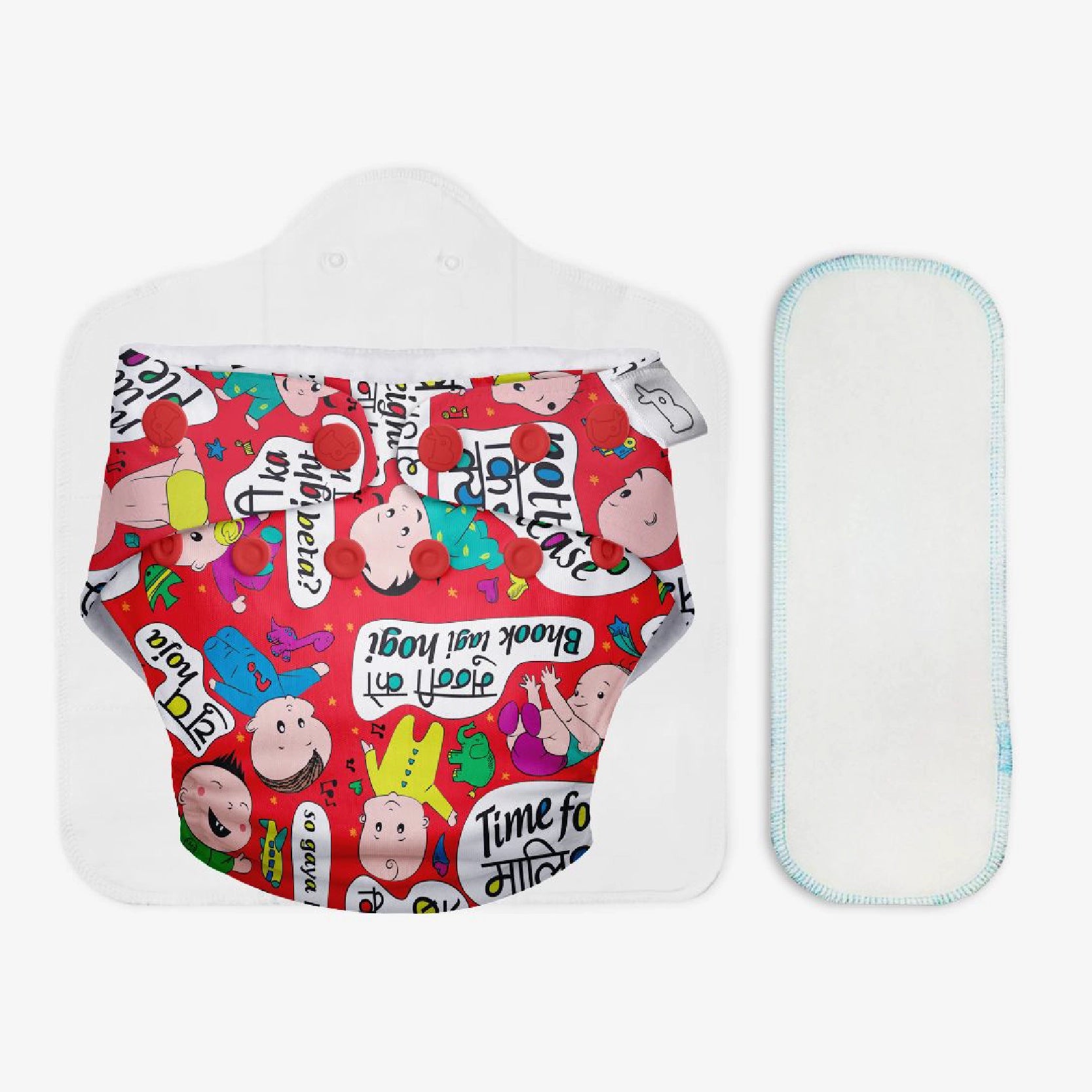Our Freesize UNO is an adjustable reusable diaper with snaps to adjust from waist, but what is unique is that, the washable diaper need not be adjusted along the length, you can simply snap on the top or the bottom row depending on the length required. To adjust along the waist, the snaps can be adjusted front or back.