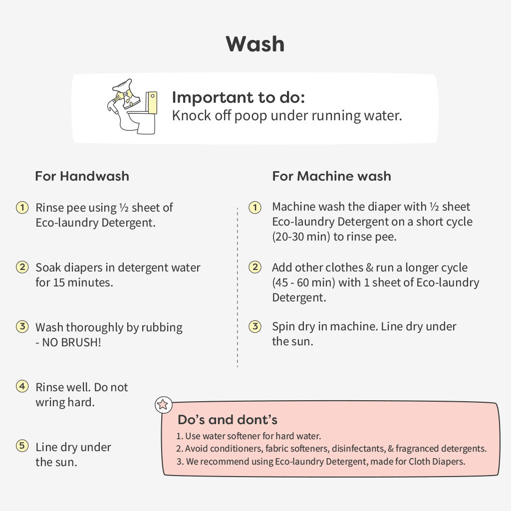 Rinse the pad with a little detergent to remove any pee or poop. Then, machine wash or hand wash with your regular laundry detergent. For optimal results, avoid using fabric softeners and bleach.