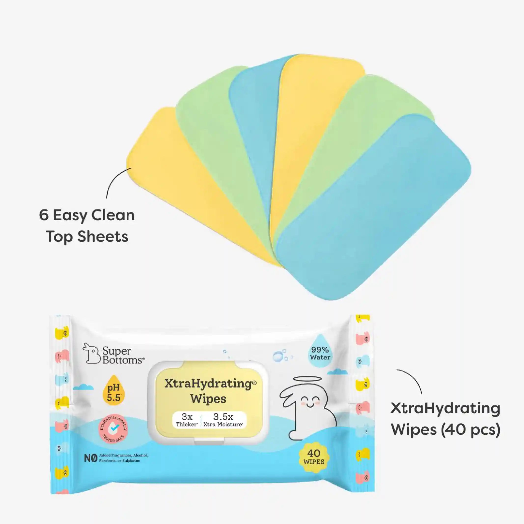 6 Pack Coloured Reusable Easy Clean Top Sheets with XtraHydrating Wipes - 40 Pack