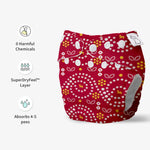 Our Freesize UNO is an adjustable reusable diaper with snaps to adjust from waist, but what is unique is that, the washable diaper need not be adjusted along the length, you can simply snap on the top or the bottom row depending on the length required. To adjust along the waist, the snaps can be adjusted front or back.