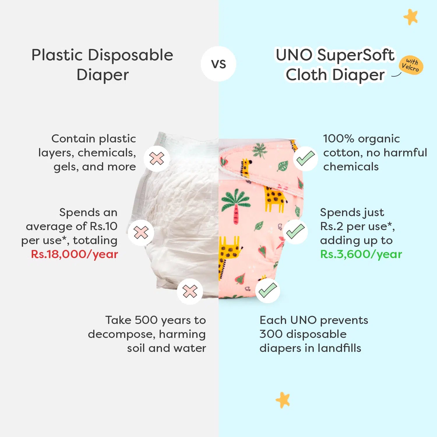 - UNO is adjustable, washable and reusable upto 300+ times whereas disposable diapers go in the landfills right after one use