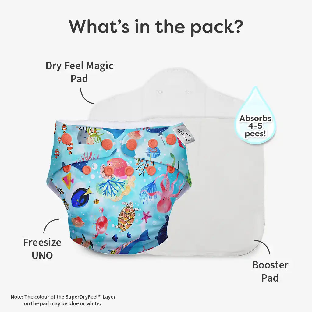 - 1 skin-friendly UNO Cloth Diaper (1 Waterproof Outer)