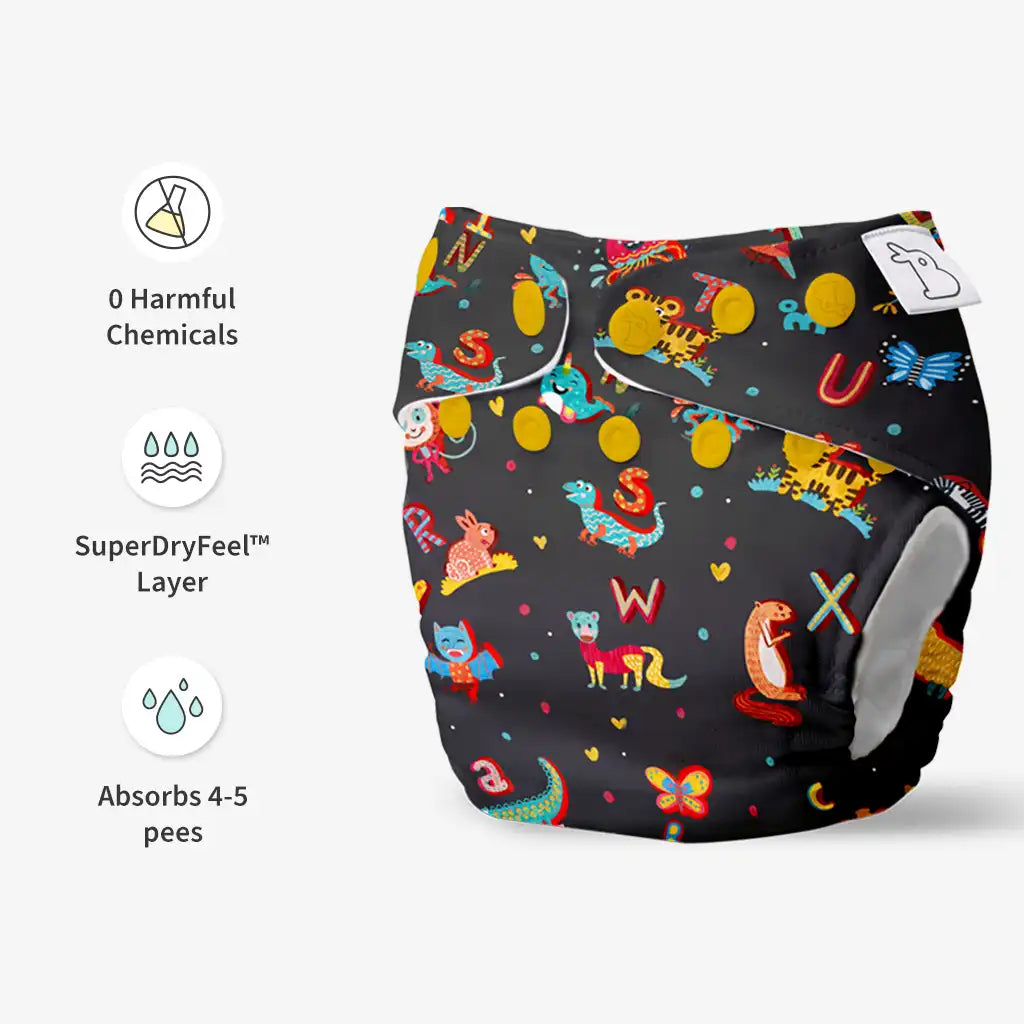 Our Freesize UNO is an adjustable reusable diaper with snaps to adjust from waist, but what is unique is that, the washable diaper need not be adjusted along the length, you can simply snap on the top or the bottom row depending on the length required. To adjust along the waist, the snaps can be adjusted front or back.