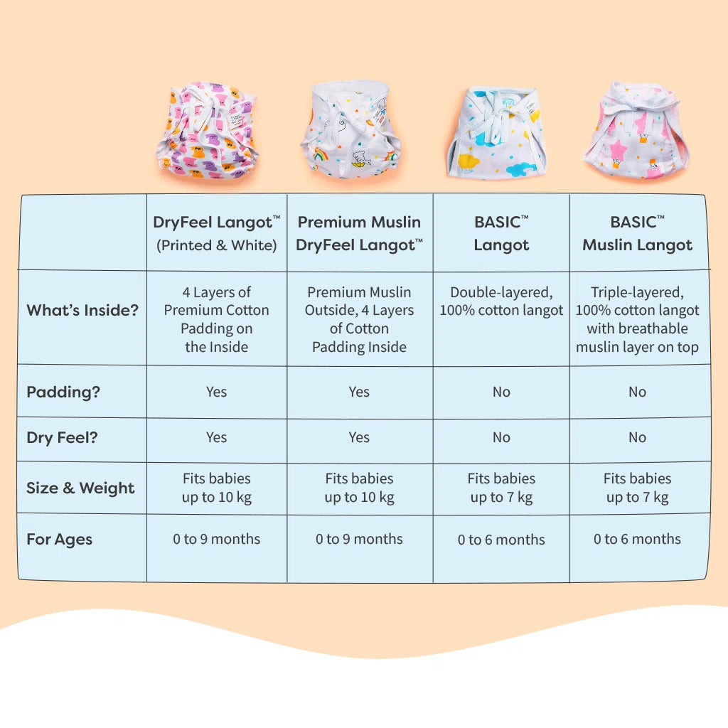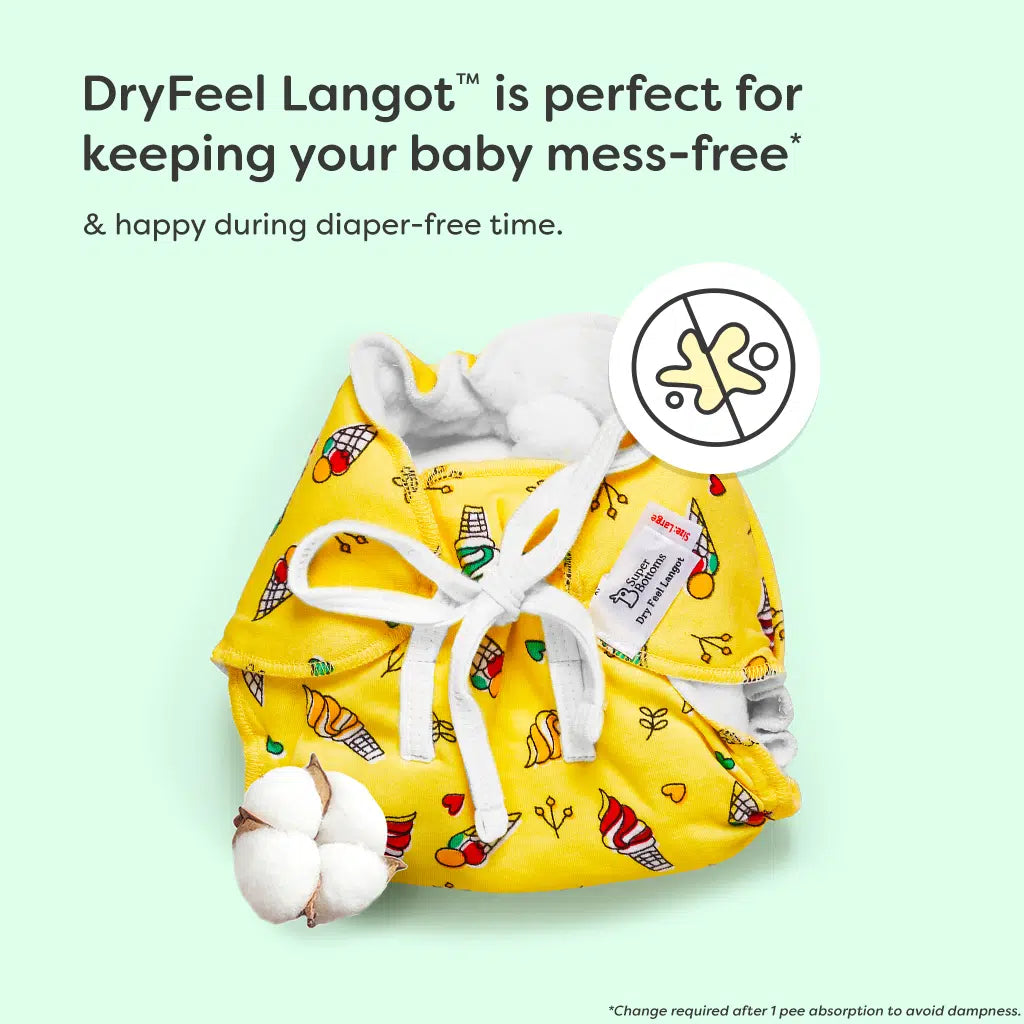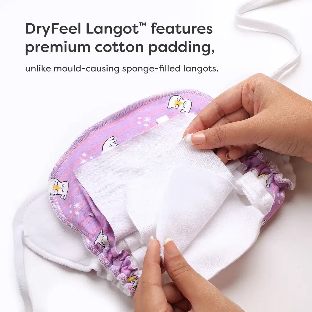 The DryFeel Langot™ is made with layers of soft, breathable cotton, unlike regular nappies that use sponge filling, which can get mouldy. It’s great for mess-free, diaper-free time, keeping your baby comfortable and clean. Plus, the double loops give you two sizes in one!