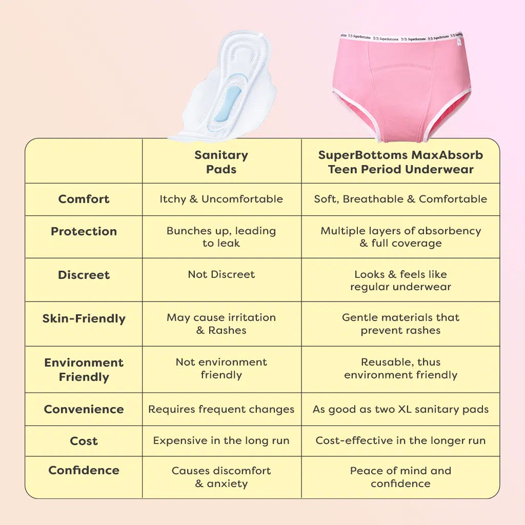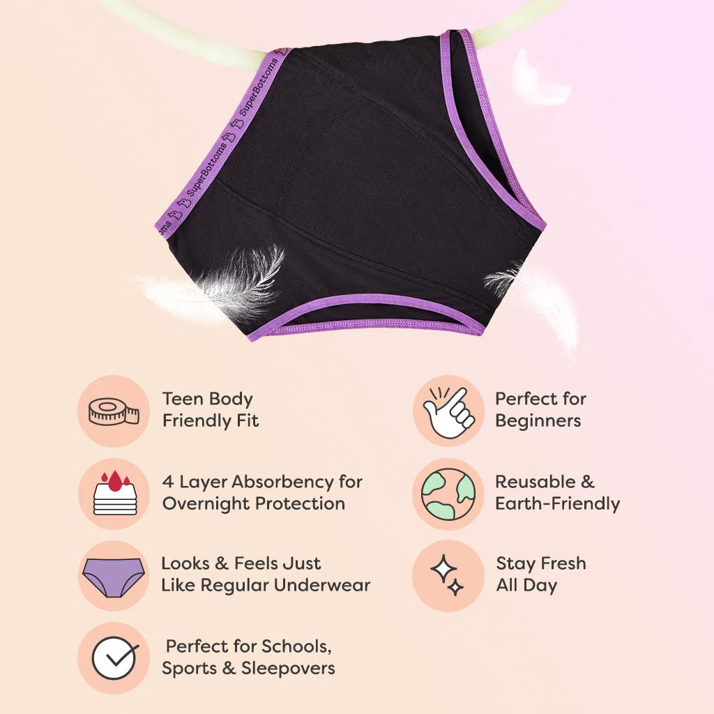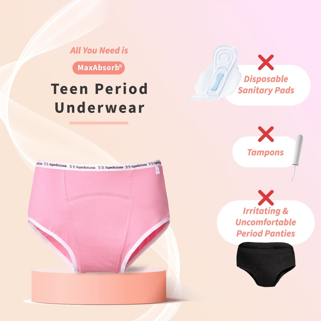 SuperBottoms Period Panties are designed with teens in mind, offering a comfortable and confident period experience. They feature multiple layers of absorbency and a teen-specific boxer fit and are made from soft, breathable materials for all-day comfort.