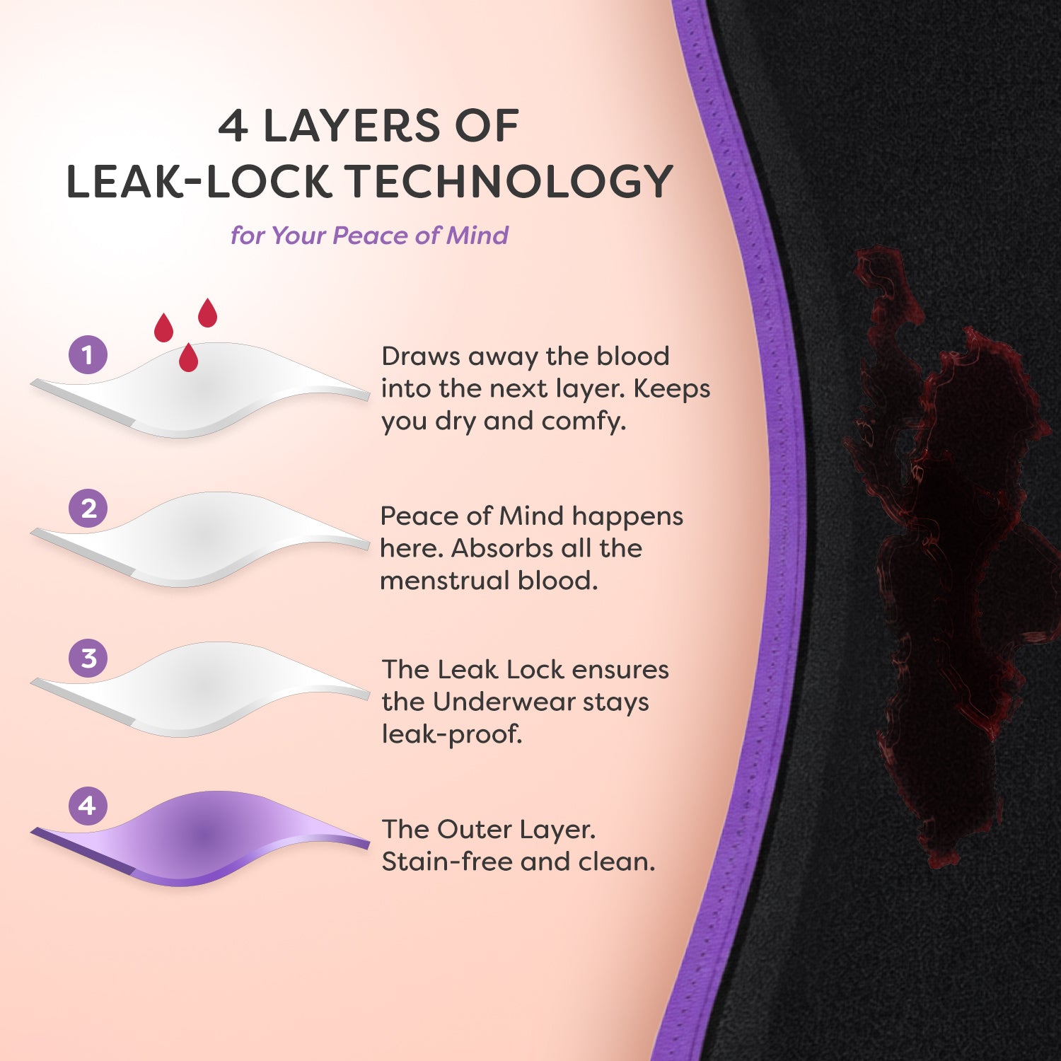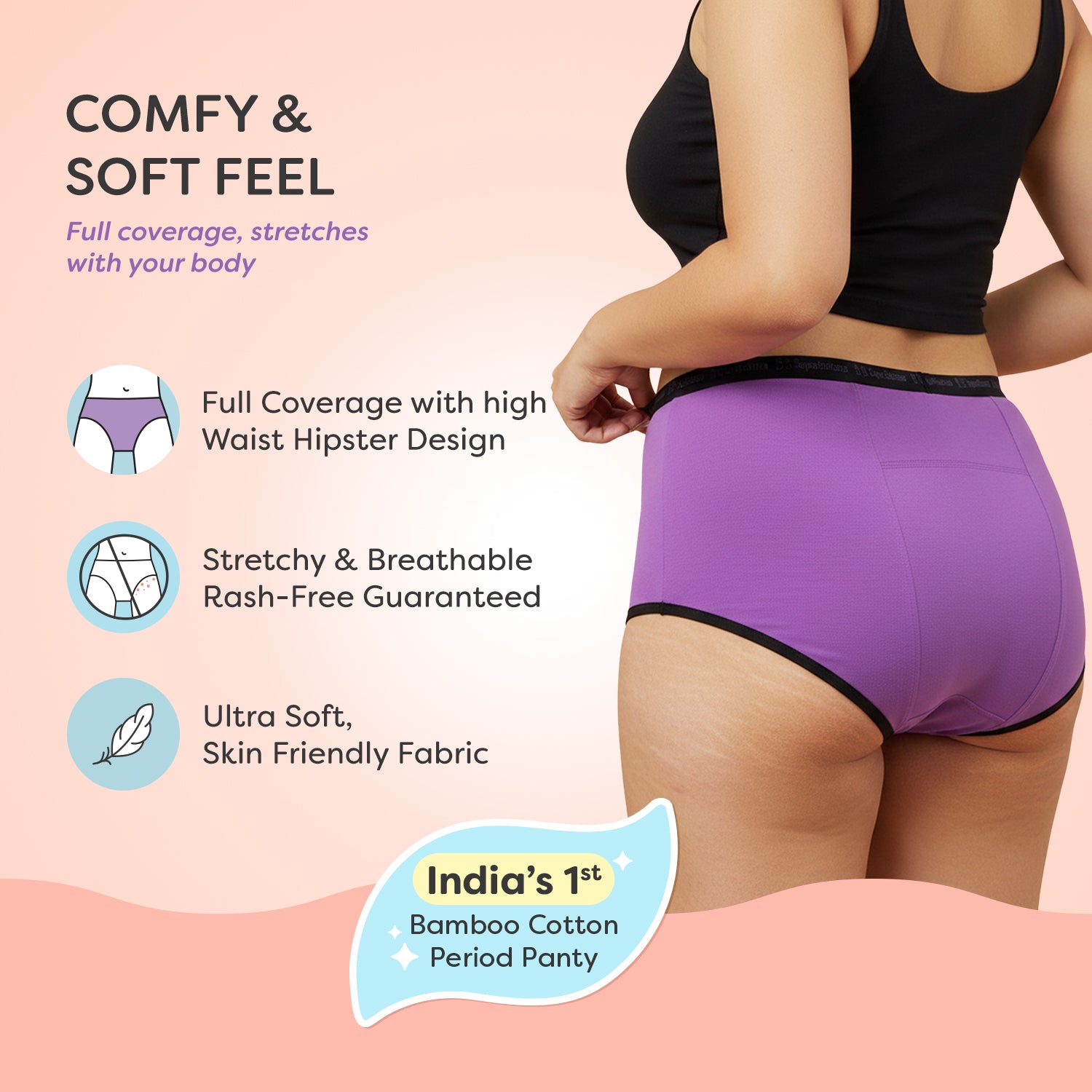 MaxAbsorb™ Period Underwear is composed of 50% Bamboo + 45% Cotton + 5% Elastane. It’s stretchy, soft, breathable, and rash-free for your period of utmost comfort.