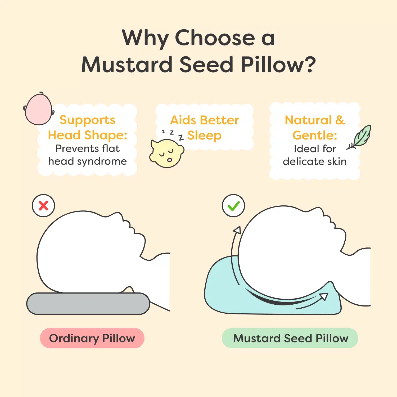 A baby pillow mustard seeds filled is a small-sized pillow for newborn babies. It is filled with natural mustard seeds and sealed in a cloth pillow cover to keep under a newborn’s head for support.