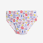 Available in 3 styles: Briefs (Unisex 2-4 years and boys/girls 4-8 years), Bloomers (Unisex 2-4 years and girls 4-8 years), and Trunks (For boys 4-8 years).