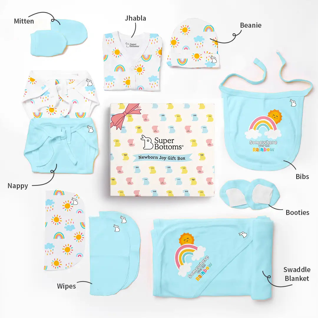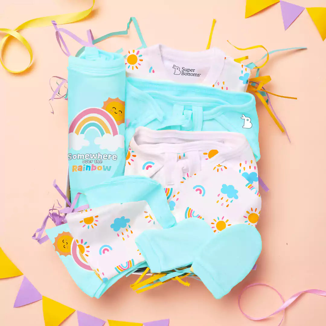 Wondering what to gift to a newborn baby? SuperBottoms brings you the perfect baby gift set for new born! It is ideal for babies from day 1 to 3 months. Contains thoughtfully handpicked 11 unisex items – 3 Reusable Baby Wipes, a Bib, a pair of Mittens and Booties each, a Beanie, a Swaddle, and a Jhabla.