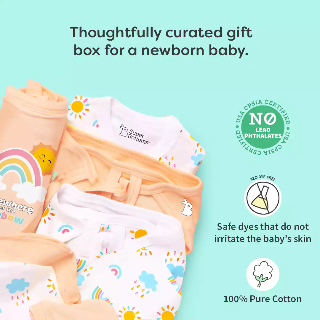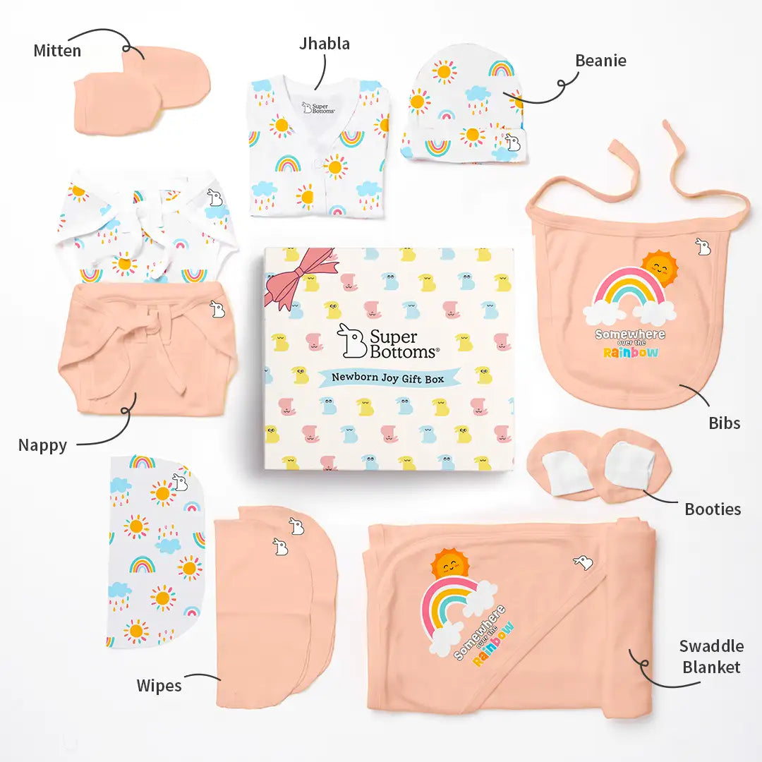 Wondering what to gift to a newborn baby? SuperBottoms brings you the perfect baby gift set for new born! It is ideal for babies from day 1 to 3 months. Contains thoughtfully handpicked 11 unisex items – 3 Reusable Baby Wipes, a Bib, a pair of Mittens and Booties each, a Beanie, a Swaddle, and a Jhabla.