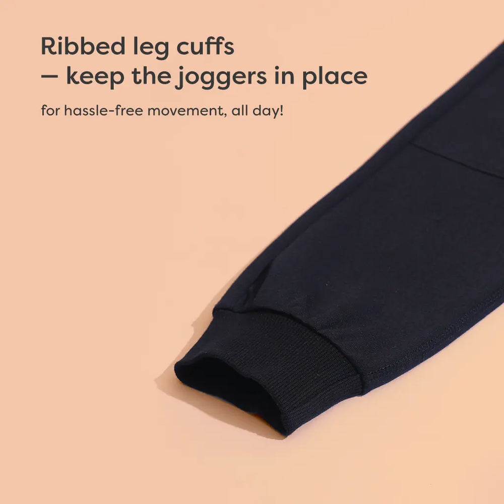 The joggers are made from a blend featuring premium Cotton blend with other blends, balancing softness and durability.
