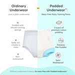Padded Underwear™ is semi-waterproof, can hold up to 1 pee, and is suitable for children from 9 months to 4 years old.