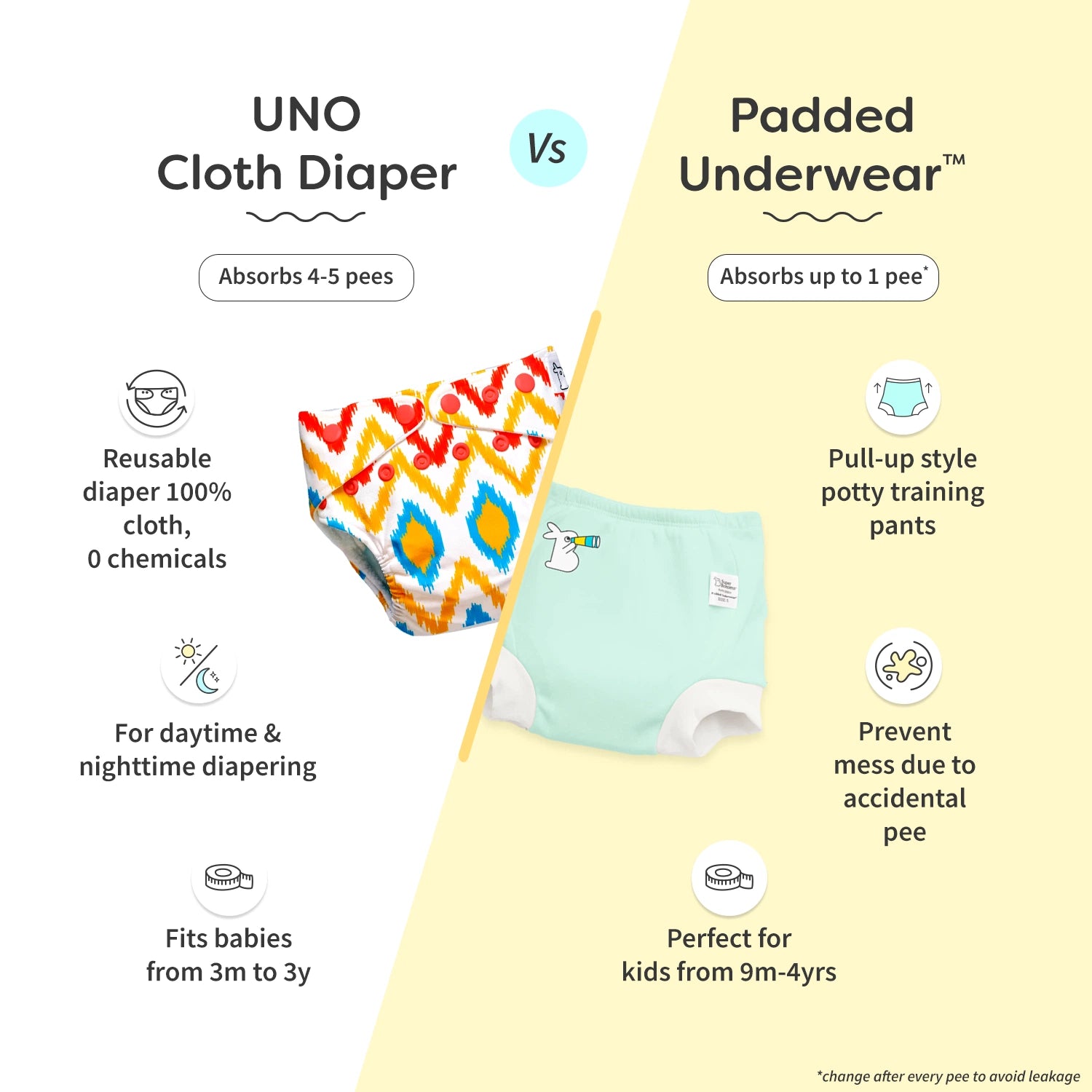 UNO is an all-night cloth diaper that absorbs 4-5 pees. Padded Underwear™ is ideal for diaper-free time and potty training, holding up to 1 pee.
