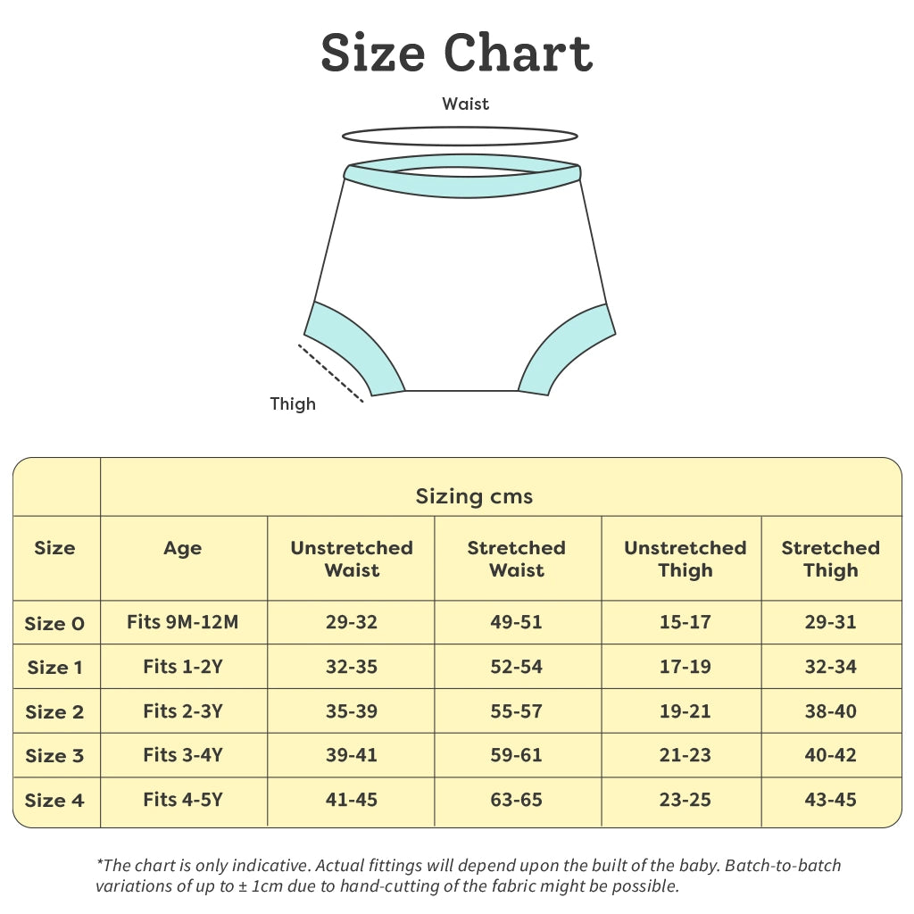 Available in various sizes (SIZE 0 for 9-12 Months, SIZE 1 for 1-2 years, SIZE 2 for 2-3 years, SIZE 3 for 3-4 years), these training offer a comfortable and practical solution for your toddler's transition. (Please refer to the size chart as each baby's body type may vary.)