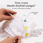 The Muslin Premium DryFeel Langot is extra special for newborns! It has four layers: a Super DryFeel Layer, two soft cotton layers, and a fully waterproof shield. But what makes it stand out is the added premium Muslin layer on top. This makes it super comfy, keeps your baby dry, and gives them the softest feel. It's way more comfy and cool than regular nappies!