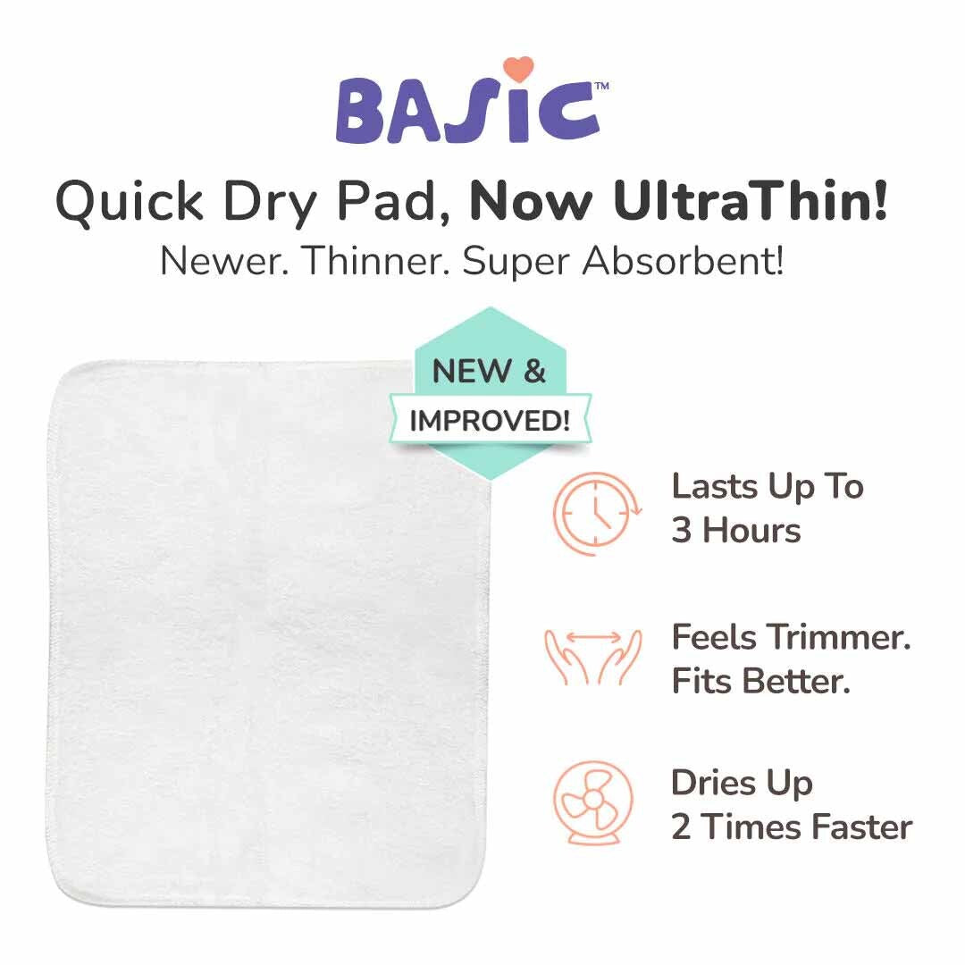 BASIC Cloth Diaper is now trimmer with a reduced number of snap buttons. Fits better, feels more comfortable. The Quick Dry UltraThin Pads are foldable style, 4 layered pads which can be attached to the cloth diaper. Its UltraThin Design is light for the baby, fits better and trimmer. It dries 2 times faster than other pads.