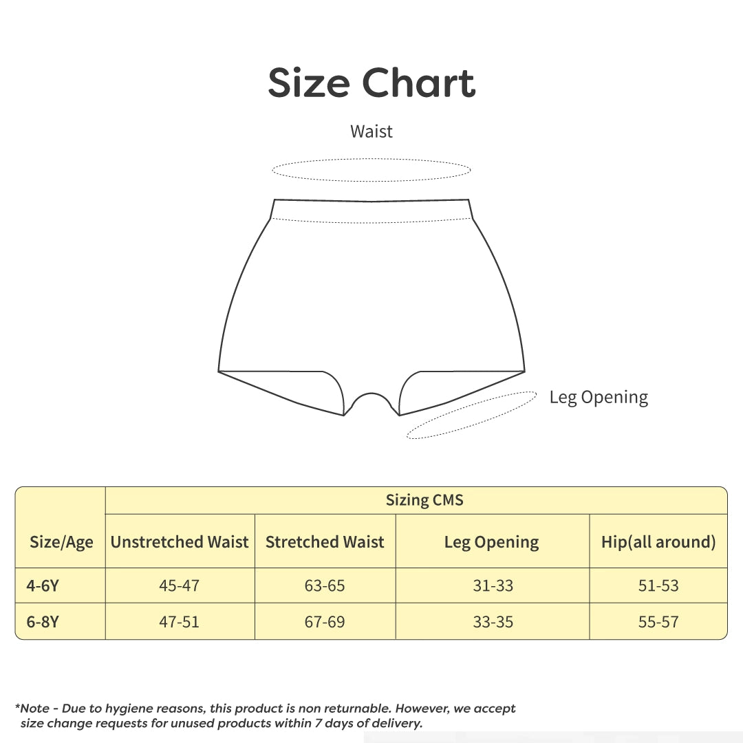 Girls' briefs, bloomers, and boyshorts: Available in sizes 4Y-6Y and 6Y-8Y