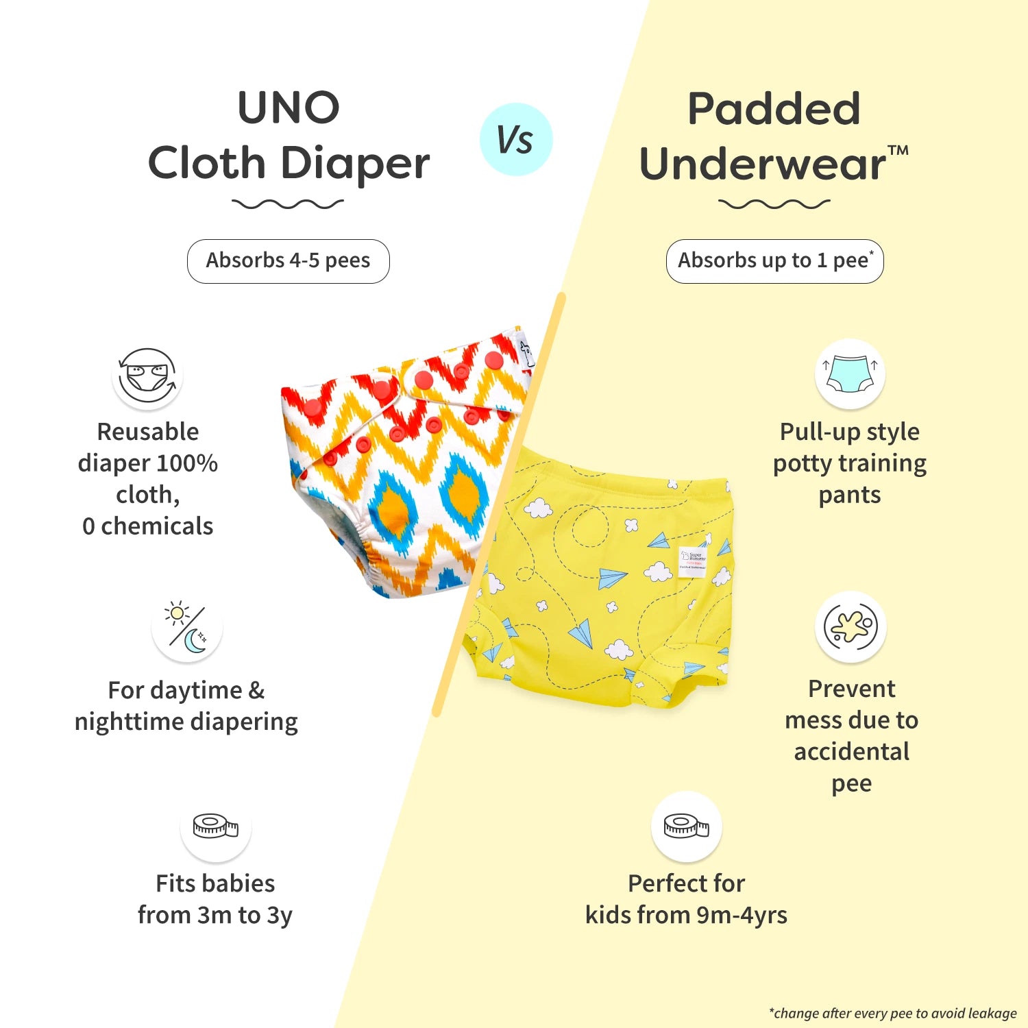 UNO is an all-night cloth diaper that absorbs 4-5 pees. Padded Underwear™ is ideal for diaper-free time and potty training, holding up to 1 pee.