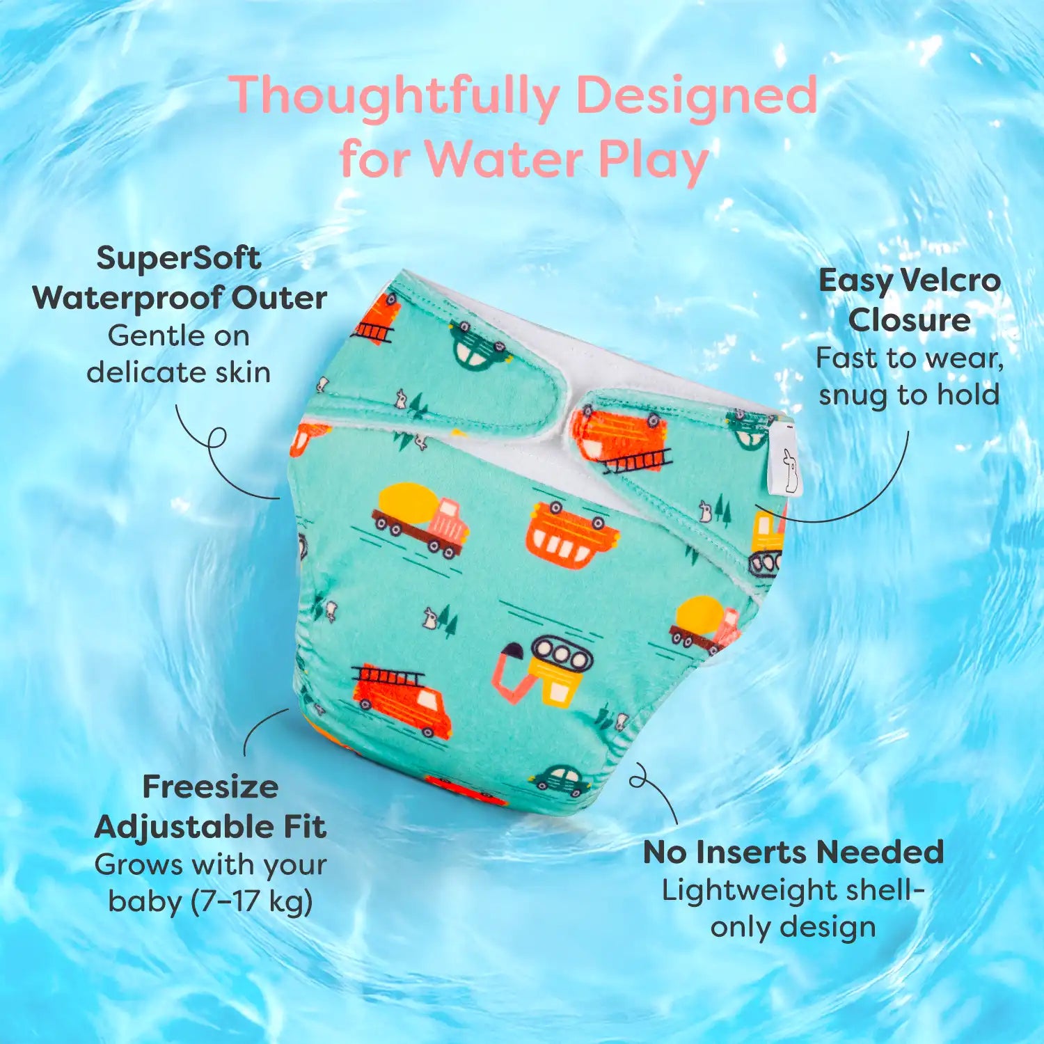 Introducing a sustainable splash-time essential – the SuperBottoms Swim Diaper Shell made with the Freesize UNO SuperSoft Outer Layer (with Velcro). Designed for babies aged 3 months to 3 years (7–17 kg), this reusable swim diaper offers a skin-safe and eco-friendly alternative to disposable swim diapers.