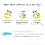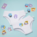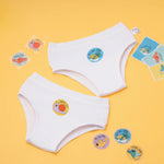It’s white bamboo underwear for kids (4–8 years) that comes with DIY sticker sheets. Kids can personalise their underwear by ironing on the stickers for fun designs.