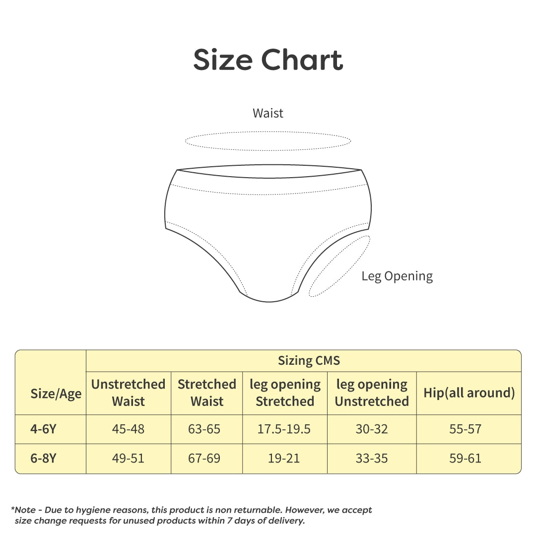 Girls' briefs, bloomers, and boyshorts: Available in sizes 4Y-6Y and 6Y-8Y