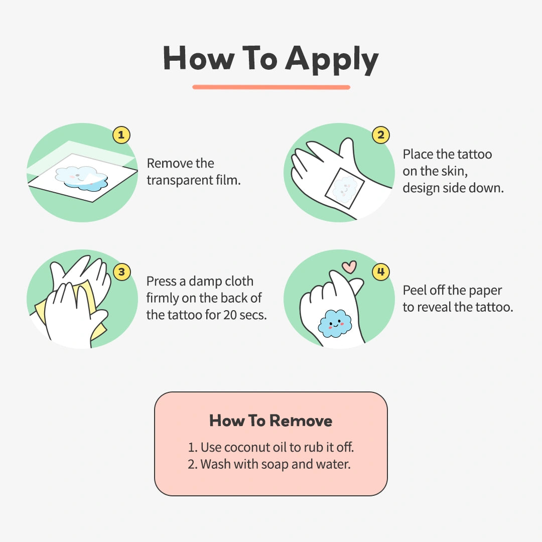 These tattoos are temporary, skin-friendly and waterproof, ensuring safe and long-lasting play. Simply peel the transparent film, apply the tattoo design-side down on the skin, press a damp cloth for 20 seconds, and reveal the fun!