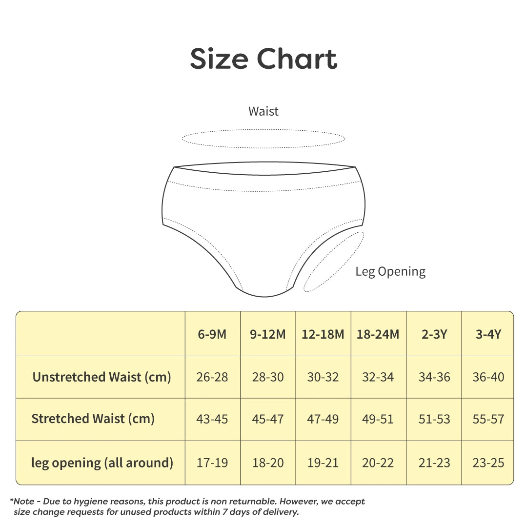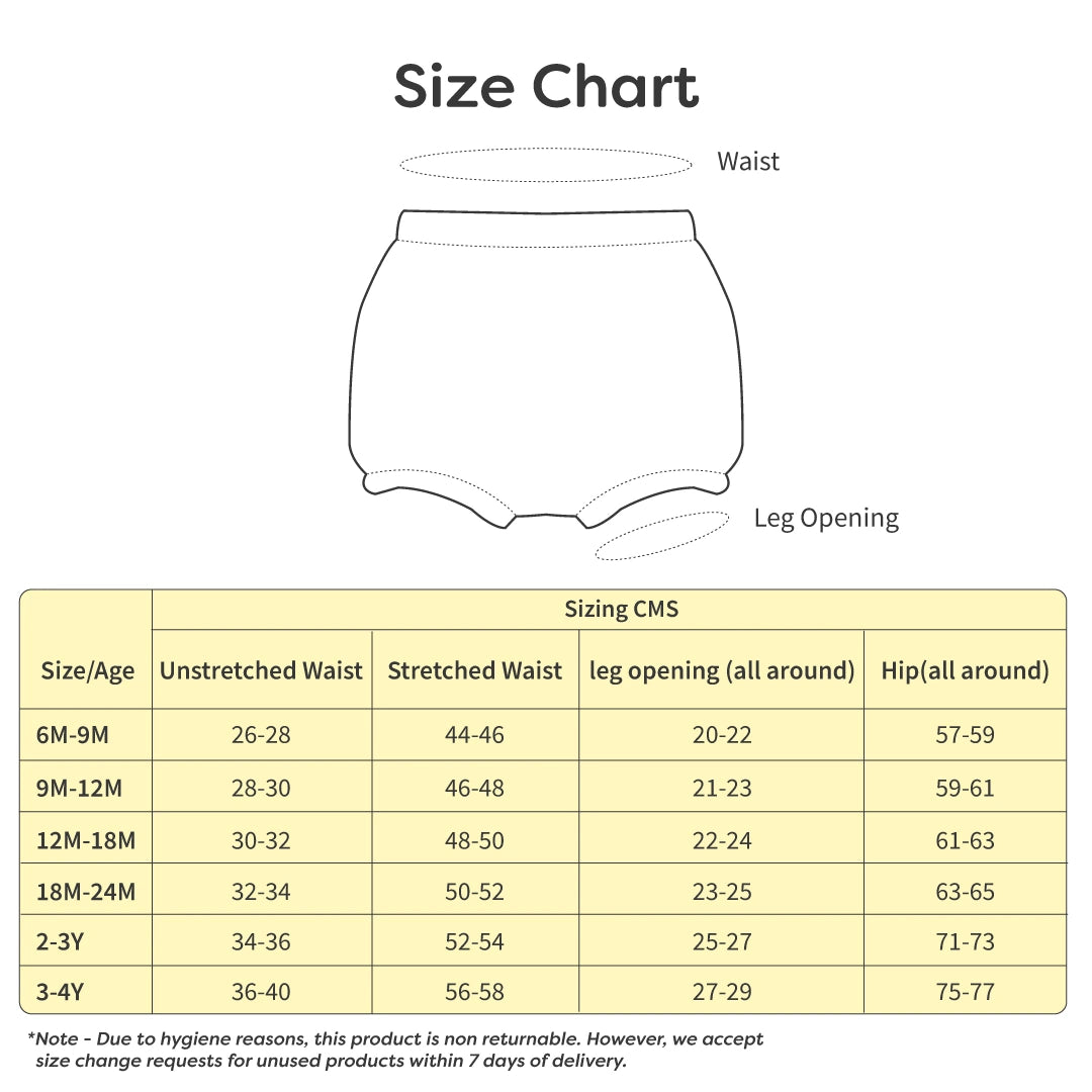 Baby briefs and bloomers: Available in sizes 6M-9M, 9M-12M, 12M-18M, 18M-24M, 2Y-3Y, and 3Y-4Y