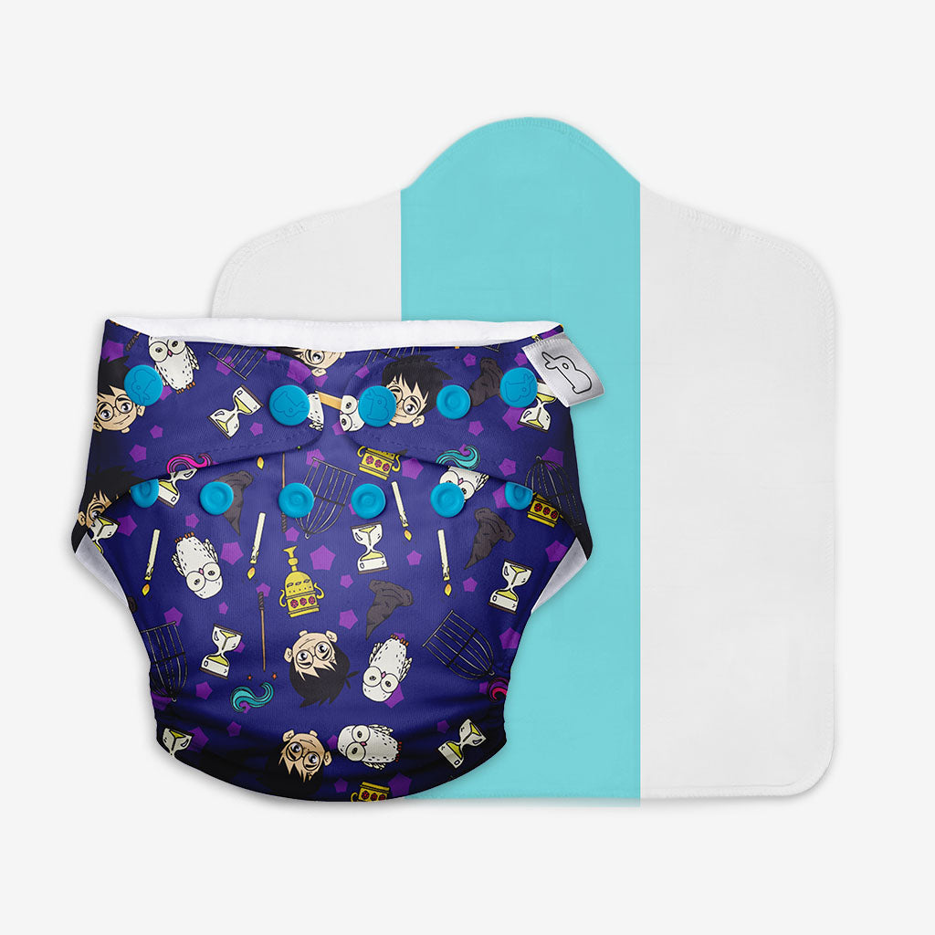Our Freesize UNO is an adjustable reusable diaper with snaps to adjust from waist, but what is unique is that, the washable diaper need not be adjusted along the length, you can simply snap on the top or the bottom row depending on the length required. To adjust along the waist, the snaps can be adjusted front or back.