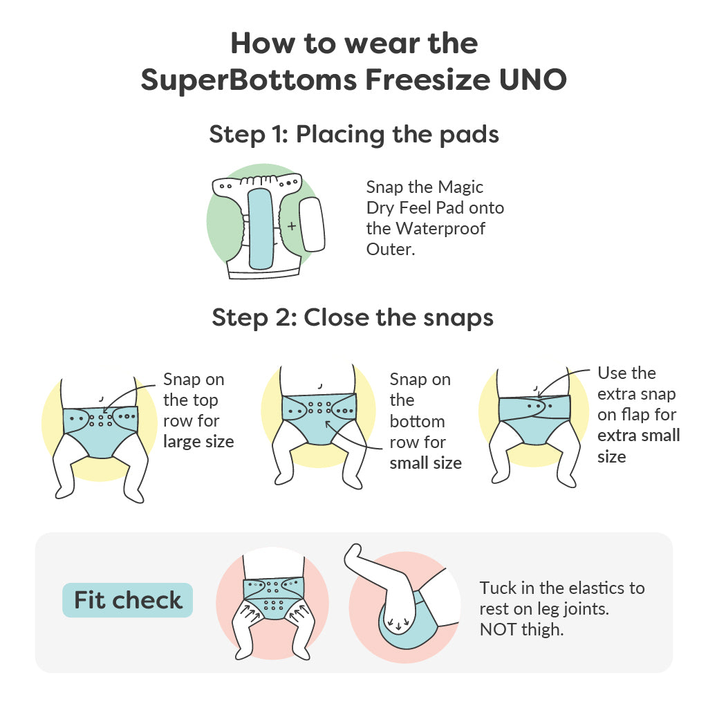 SuperBottoms Freesize UNO cloth diaper is made from 100% Organic Cotton Pads with Super DryFeel Layer that keeps baby’s bums dry and helps in reducing rashes significantly. It is a washable and reusable cloth diaper which makes it pocket-friendly as well as eco-friendly. It is ideal for babies from 7 kg - 17 kg.