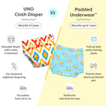 UNO is a 12 hr absorbency cloth diaper that last all night and Padded underwear are are ideal for diaper free time and potty training and hold 1 pee. UNO Cloth Diaper is waterproof, lasts all night, is perfect for diapering and can be used from 0 to 3 years while Padded Underwear, is ideal for diaper-free time and potty training.