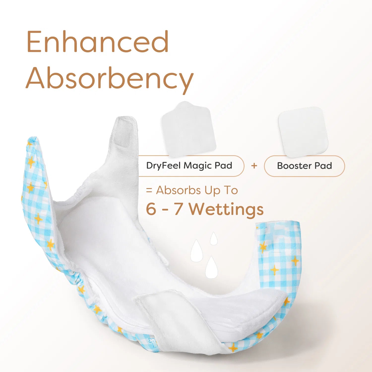 Absorbency depends on the baby’s wetting pattern. It is designed to absorb 6–7 wettings when changed regularly.