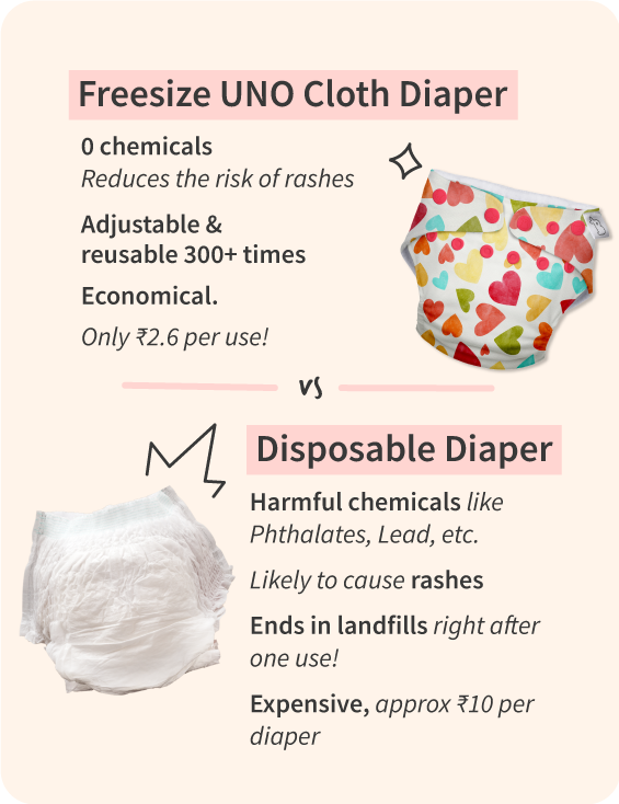 - UNO is adjustable, washable and reusable upto 300+ times whereas disposable diapers go in the landfills right after one use
