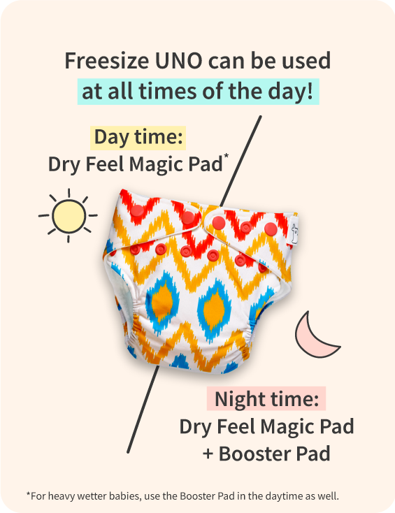 Freesize UNO lasts about 10-12 hrs for most average to heavy wetting babies when used along with the booster pad. However, if your baby is a very heavy wetter, you can add a Very Heavy Wetter Booster Pad for extra absorption. We suggest you reach out to us on our helpline if you feel that the diaper is not lasting all night for your baby. We can consult you personally on customizing the absorbency of your diaper.