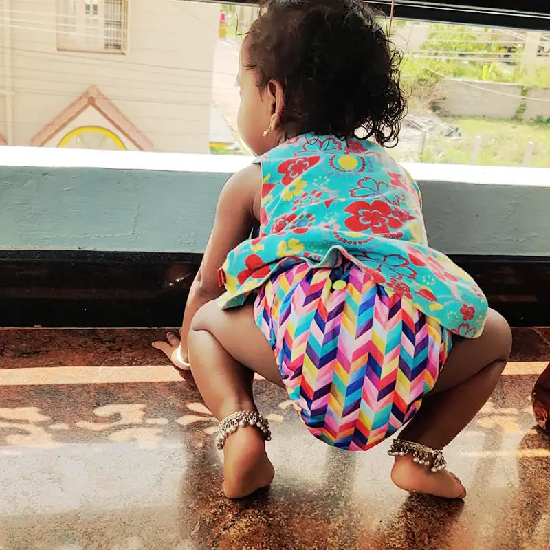 Our Freesize UNO is an adjustable reusable diaper with snaps to adjust from waist, but what is unique is that, the washable diaper need not be adjusted along the length, you can simply snap on the top or the bottom row depending on the length required. To adjust along the waist, the snaps can be adjusted front or back.